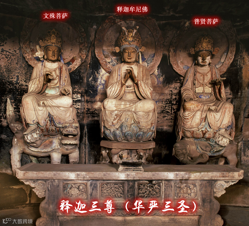 娑婆世界教化众生的释迦牟尼佛,左胁侍是以智慧闻名的文殊菩萨,右胁侍菩萨是以大行闻名的普贤菩萨,三者合称释迦三尊,又称华严三圣。