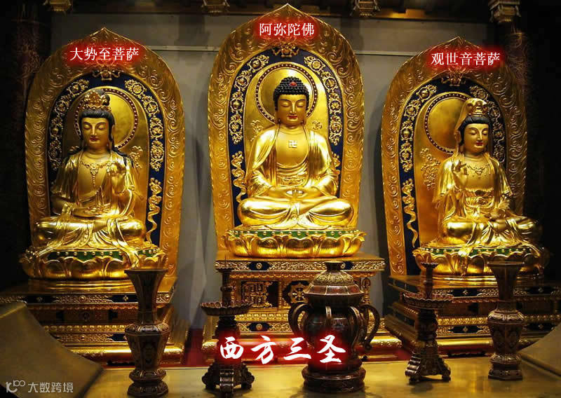 西方三圣,是指阿弥陀佛、观世音菩萨和大势至菩萨。阿弥陀佛是表无量光明,无量寿命,无量功德。观音菩萨是表大慈悲。大势至菩萨是代表喜舍。
