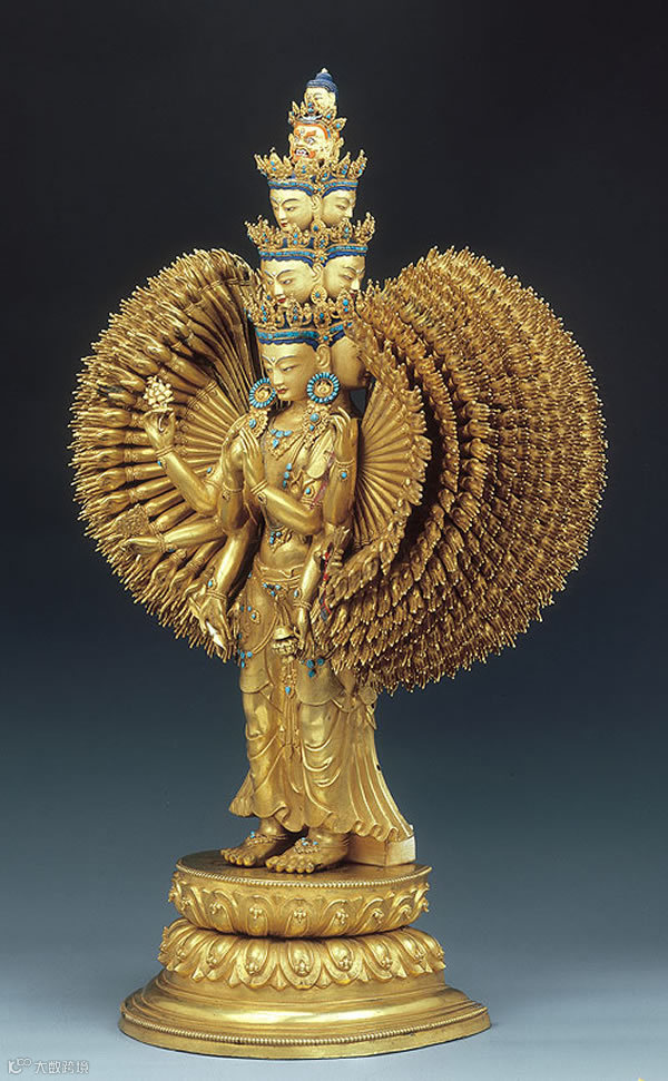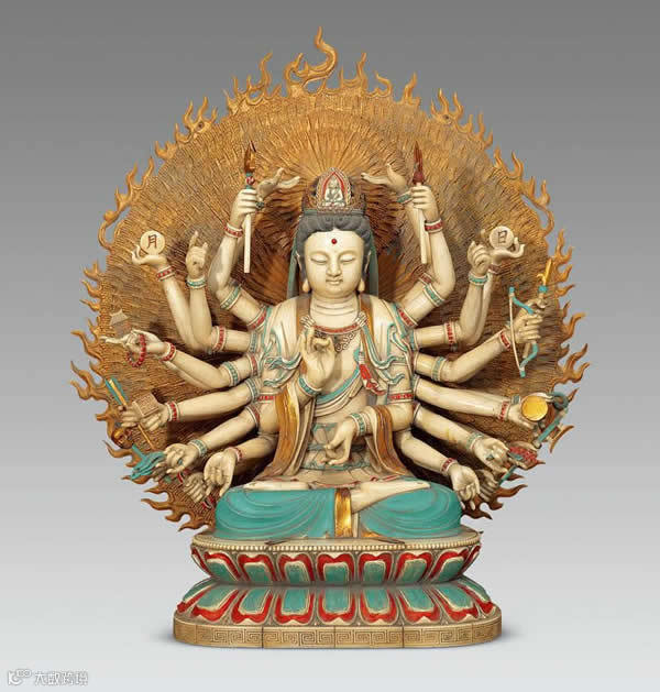 千手观音菩萨的形象,常以六手、四十二手等象征千手,每一手中各有一眼。千手观音菩萨的千手表示遍护众生,千眼则表示遍观世间。