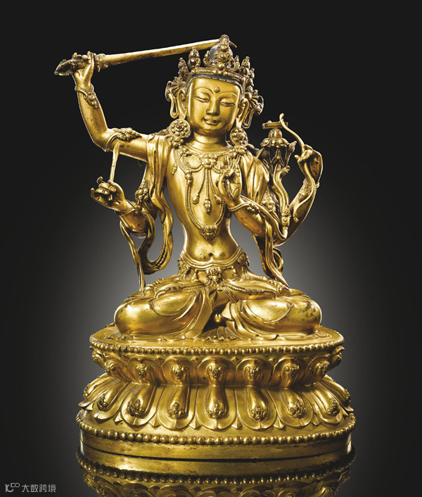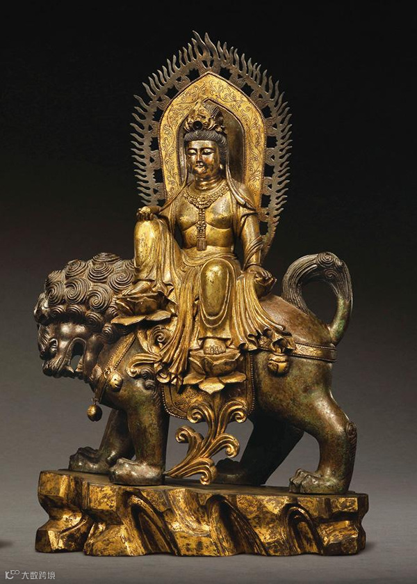 文殊菩萨形象多变,形象一:手持如意,代表以如意智慧破除烦恼;坐骑为狮子。形象二:右手持金刚宝剑(表示智能之利),能斩群魔,断一切烦恼;左手持青莲花,花上有金刚般若经卷宝,象征所具无上智慧。