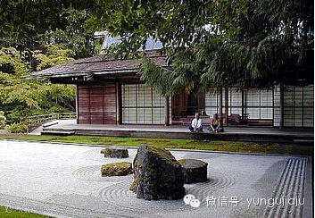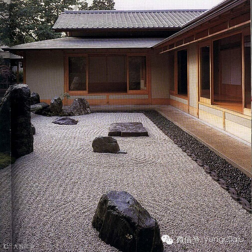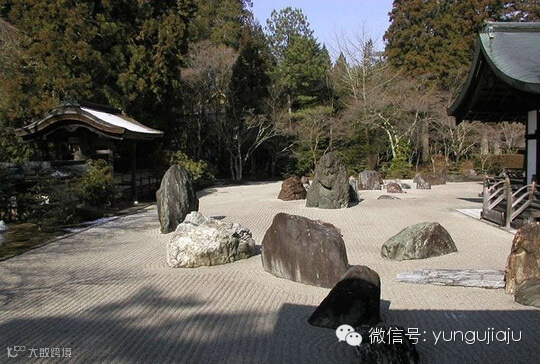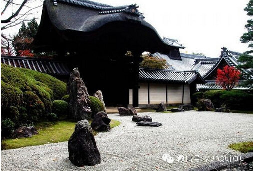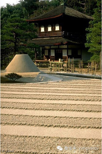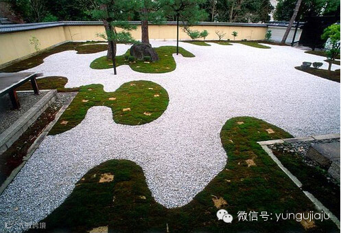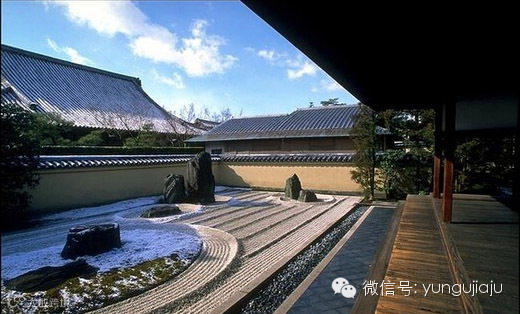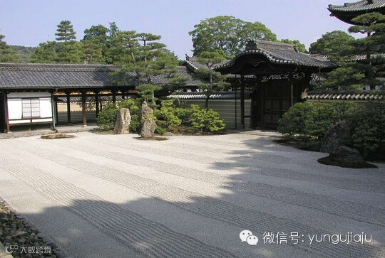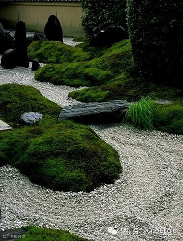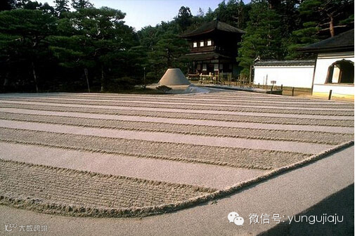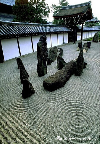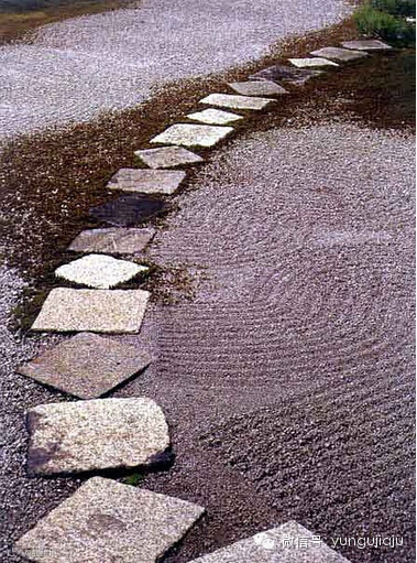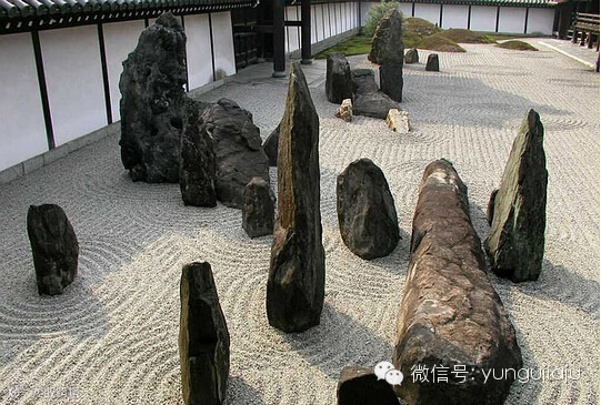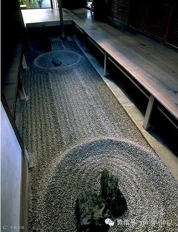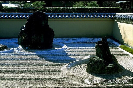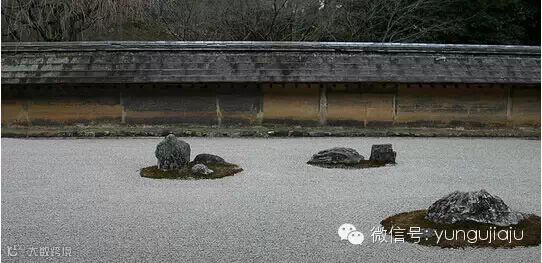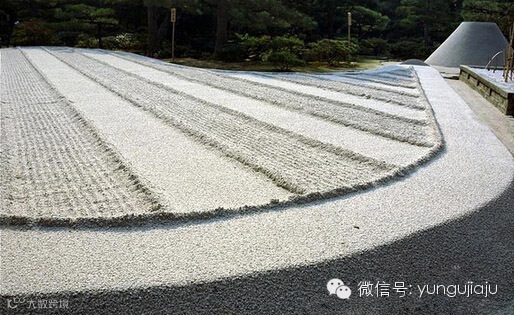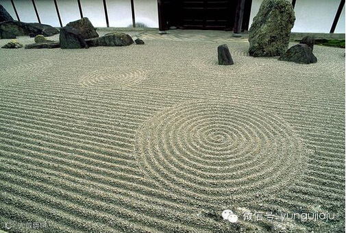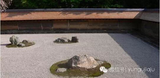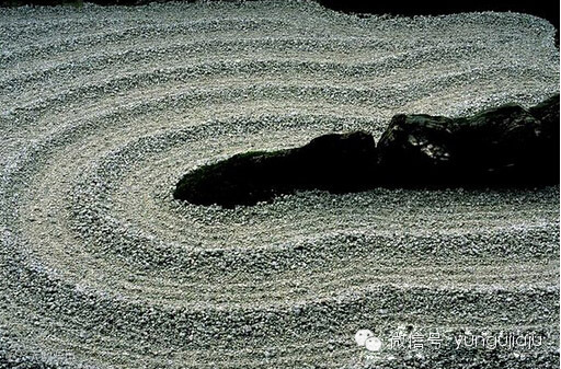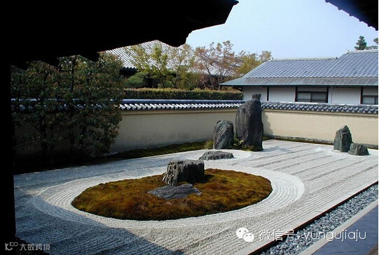 禅宗庭院内,树木、岩石、天空、土地等常常是寥寥数笔即蕴涵着极深寓意,在修行者眼里它们就是海洋、山脉、岛屿、瀑布,一沙一世界,这样的园林无异于一种精神园林。后来,这种园林发展臻于极致——乔灌木、小桥、岛屿甚至园林不可缺少的水体等造园惯用要素均被一一剔除,仅留下岩石、耙制的沙砾和自发生长与荫蔽处的一块块苔地,这便是典型的、流行至今的日本枯山水庭园的主要构成要素。而这种枯山水庭园对人精神的震撼力也是惊人的。