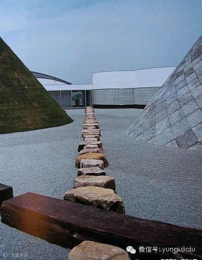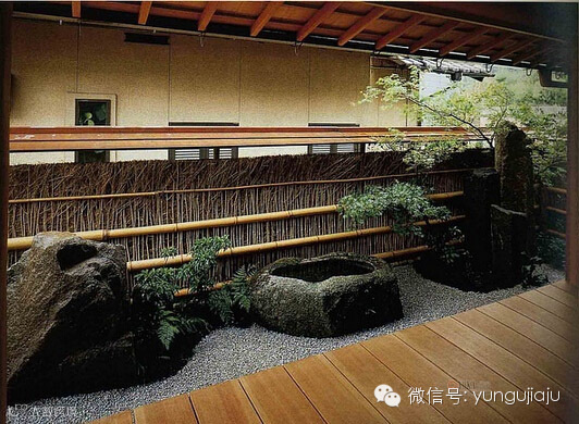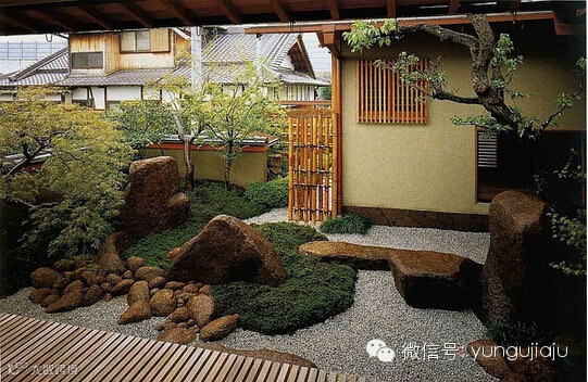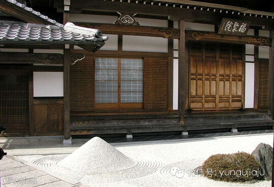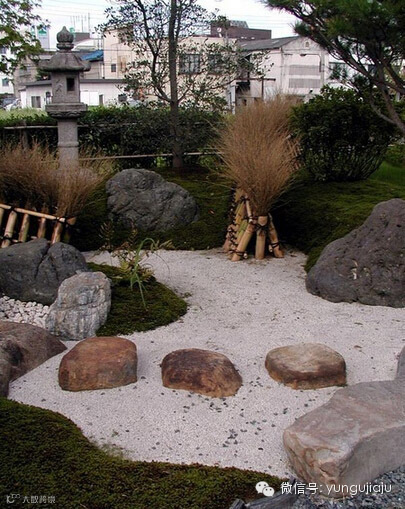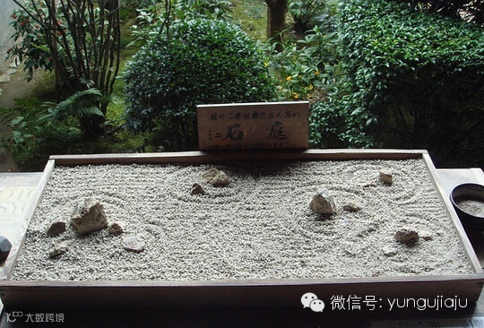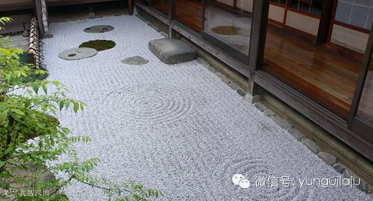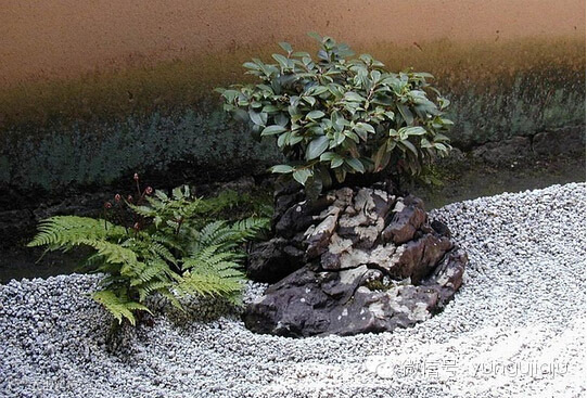 枯山水是源于日本本土的缩微式园林景观,多见于小巧、静谧、深邃的禅宗寺院。在其特有的环境气氛中,细细耙制的白砂石铺地、叠放有致的几尊石组,就能对人的心境产生神奇的力量。枯山水用石块象征山峦,用白沙象征湖海。只点缀少量的灌木或者苔藓、薇蕨。