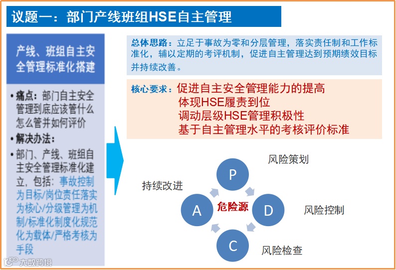 立足于事故为零和分层管理,落实责任制和工作标准化,辅以定期的考评机制,促进自主管理达到预期绩效目标并持续改善