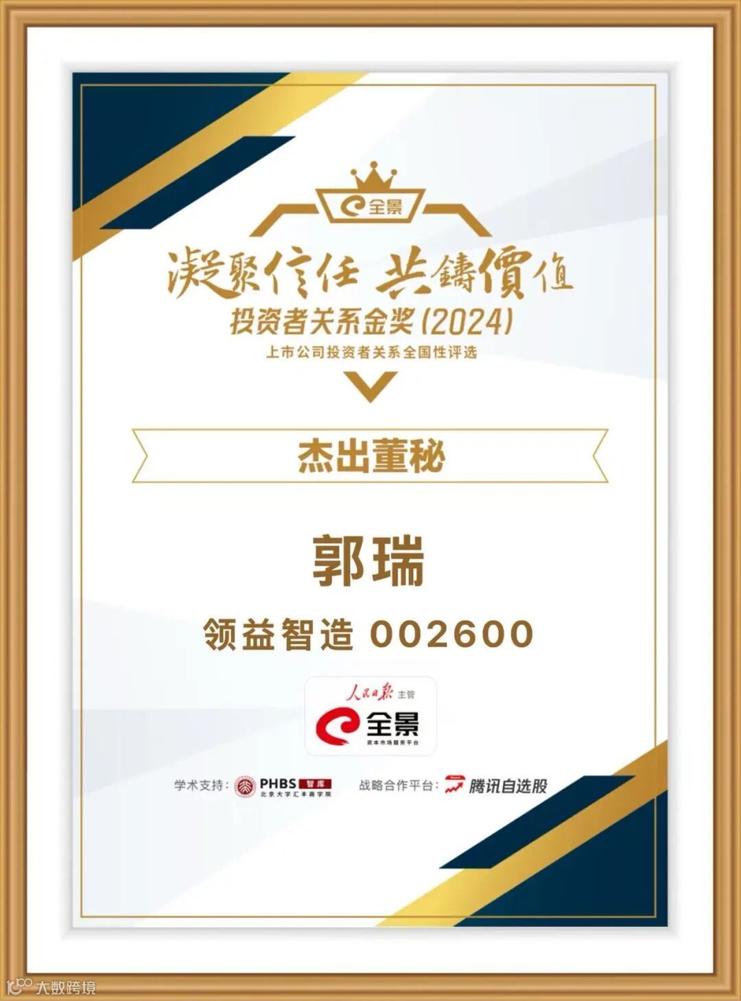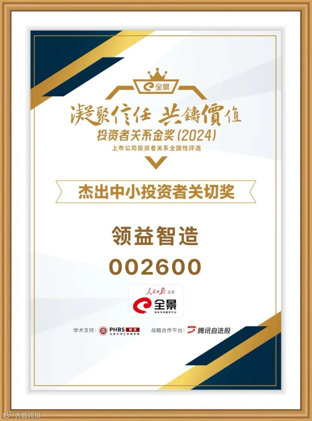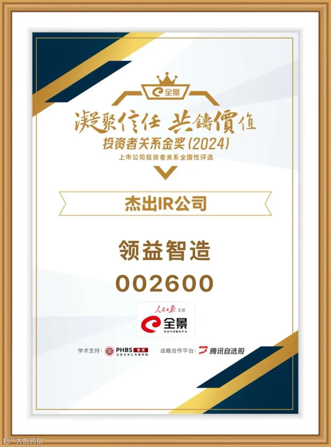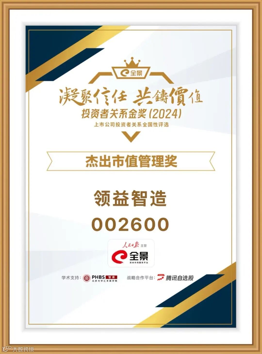 此次全景投资者关系金奖评选,由人民日报主管、全景网主办,北京大学汇丰商学院学术支持、腾讯自选股战略合作,聚焦信息披露、投资者沟通、价值创造等核心维度,是资本市场极具含金量的投关领域权威评选。