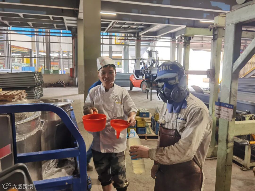 随着冰块的到来,行政部事务部饭堂的师傅们也开着三轮车陆陆续续地进入了生产车间,他们一般早上7:20就开始送凉茶和清补凉汤等,下午两点左右,又会送上绿豆汤水。他们也是忙忙碌碌地穿梭在车间里,走走停停。由于生产节拍的紧张,他们会亲手把解暑降温的凉茶等,盛到每一位有需要的兄弟的杯子里,然后再把杯子送到他们的手上。大家都心照不宣,无需多言。恰恰是这样的一幕,更能体现出中集兄弟们之间的爱与关怀。