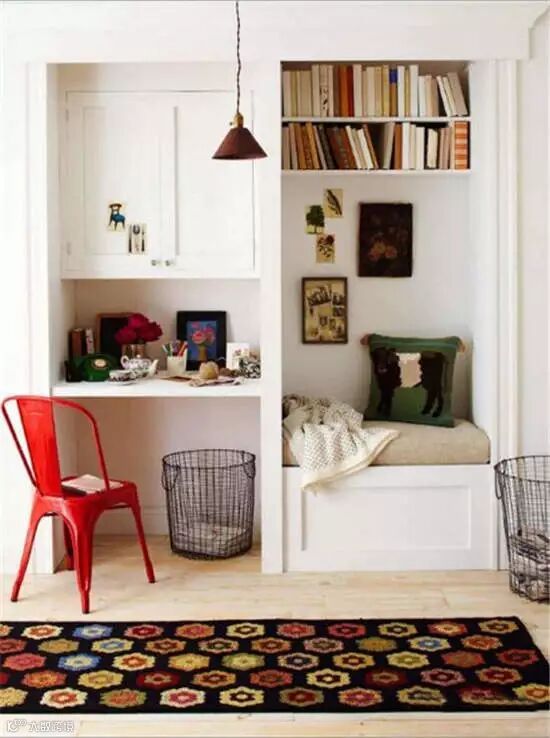 只需要一个小小的衣柜空间,加减几块板子,再配上五颜六色的靠垫和极具特色的软帘,立马充满书香气。