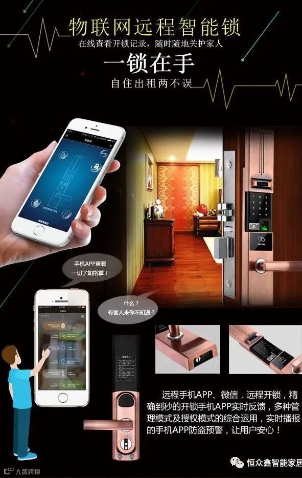 老人有时记性会比较差,忘记带钥匙出门或者钥匙丢了,总会带来很多麻烦。智畅智能门锁可设置密码和指纹,指纹锁联动可执行回家模式和离家模式,回家开门后灯光全部亮起,离家关门后灯光全部关闭。还可以设置双指纹开锁,一组指纹用于正常开门,一组指纹突遇危险时可用指纹开锁报警,把报警信息推送给你的家人。同时还可以远程控制,即便老人出门买菜不方便开门,子女也可以远程通过APP给老人开门,安全又实用!