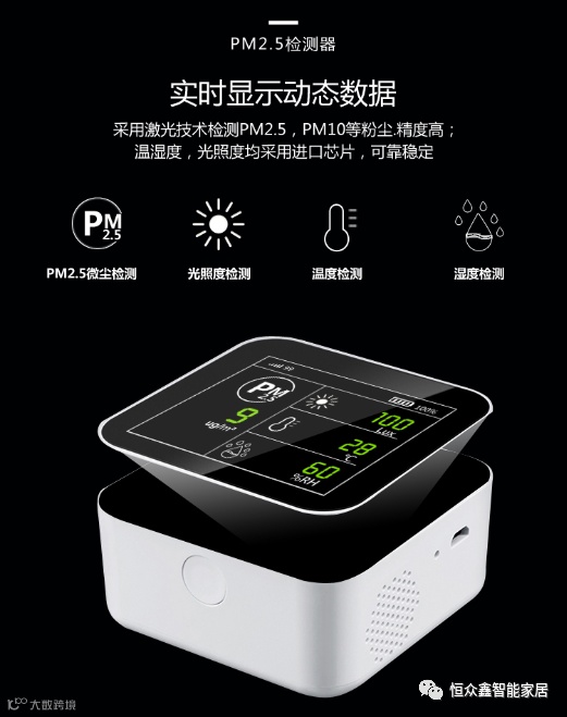 环境检测现在也成为现代家庭必备的生活设备,每年因环境污染造成的身体健康原因不计其数。恒众鑫的多功能智能环境检测器可以全方位的监测家中的环境状况,包括温度、湿度、PM2.5、光照强度等多纬度信息,是给父母居家环境保护的贴心产品,通过恒众鑫智能家居手机APP上也会同步上报实时信息,是老人生活家居必备的智能设备!