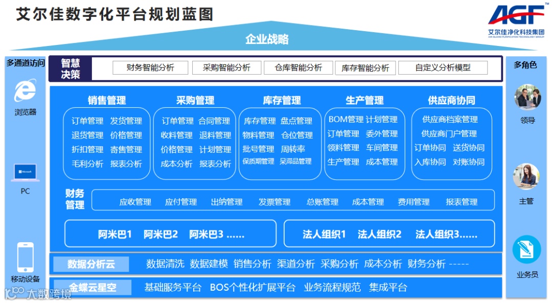 艾尔佳数字化平台规划蓝图将涵盖销售管理、采购管理、库存管理、生产管理和财务管理等方面的数字化转型。通过金蝶ERP二期项目的实施,艾尔佳将进一步提升公司的运营效率、降低成本,并为业务发展提供更好的数据支持和决策依据。其次,该项目将进一步打通上下游,优化供应链管理。通过与供应商建立更紧密的协同关系,艾尔佳能够更准确地预测需求,更快速地响应市场变化。此外,通过优化库存和销售管理,使得艾尔佳能够更好地满足客户需求,提高客户满意度。最后,金蝶ERP二期项目还将帮助艾尔佳净化科技集团和各子公司间实现业务系统和财务系统的串联,形成闭环。使集团公司的决策者能够更全面、更及时地了解整个集团的运营状况,为未来制定集团战略发展方向提供更准确的数据支持。