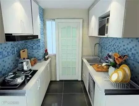 通常厨房门开在中间的过道型厨房适合双线性橱柜布局,如果厨房比较大,也可以把岛台与墙边平行摆放,也能布置成双线型。这样布局同样布局合理,空间利用率高。