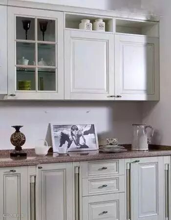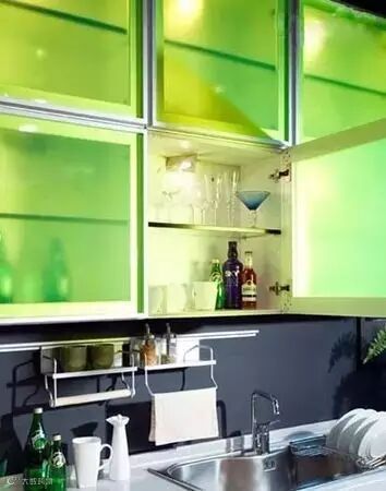 很到家里厨柜的选材采用的是实木材料,但是柜门合拢的严密性却导致了取用物品时的不便。那么选择玻璃柜门就能解决这一缺点,而且玻璃的透明感让这些物品看起来一目了然,使用起来也很方便。
