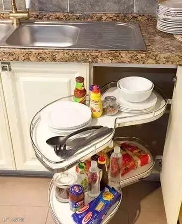 在橱柜中还可以利用转角的空间设计转角层架,这样不仅方便一些常用物品的收纳,使用起来也非常方便。如果你家的厨房用的是L型或者U型的橱柜,建议都可以考虑设计一个转角层架哦。