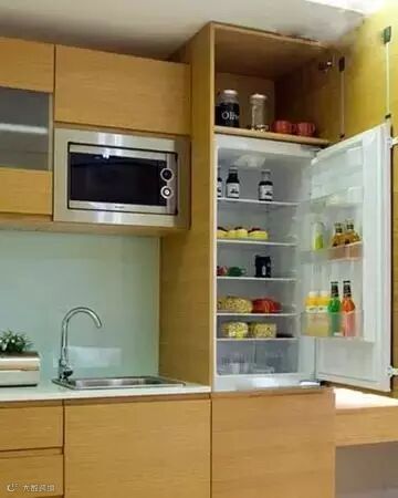 等厨柜安装好,也便差不多走到了最后一步:购买冰箱、小家电以及五金挂件。购买冰箱前要量好尺寸,小家电如微波炉如果要挂在墙上,就要事先买好搁架,五金小挂件也要根据实际情况配置,这些都可以请装修队的师傅安装。