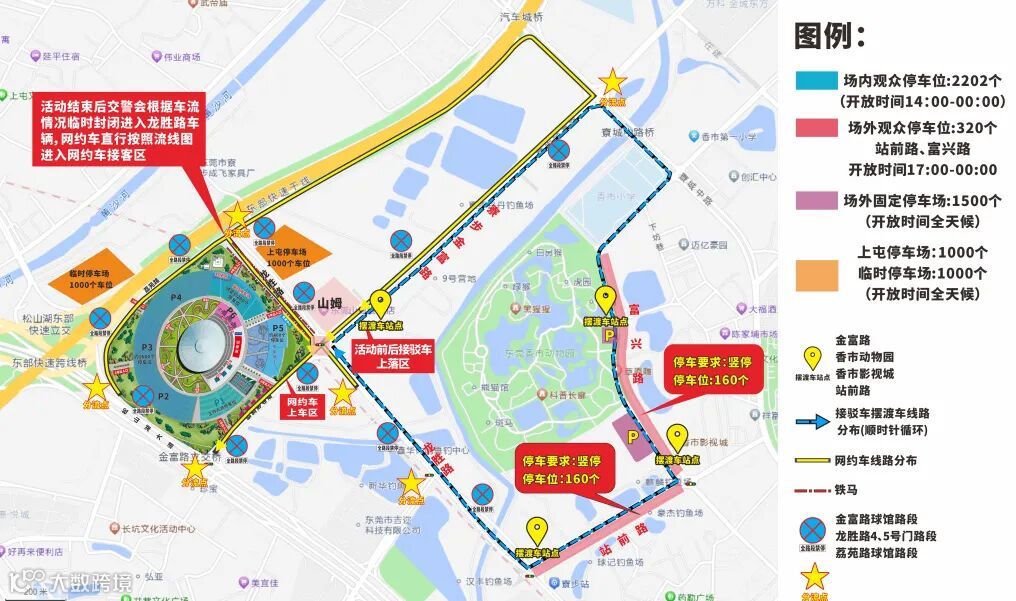 演出日东莞银行篮球中心开放P2、P3、P4、P5停车场,观众车辆可从2/3/6号门进入场馆停车。