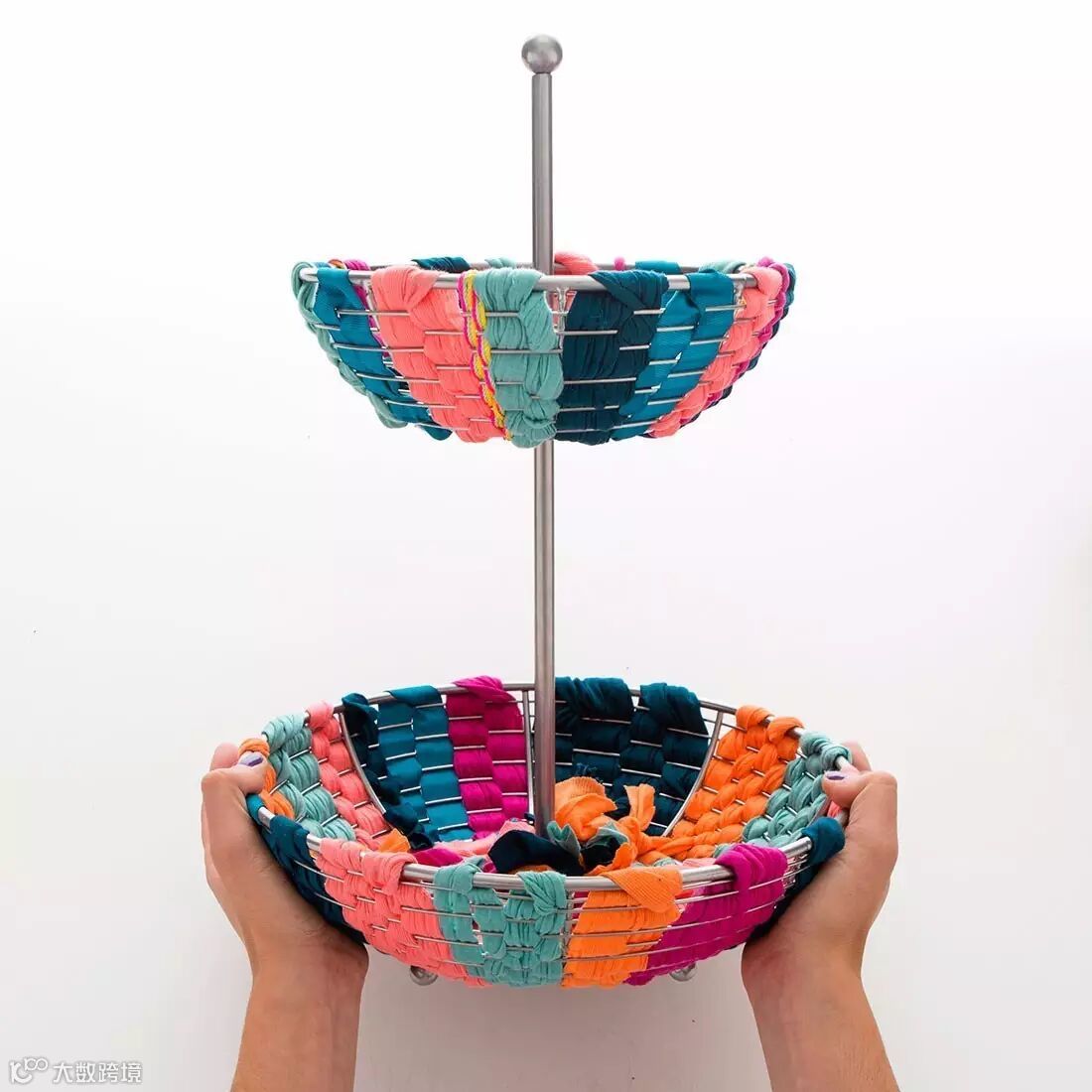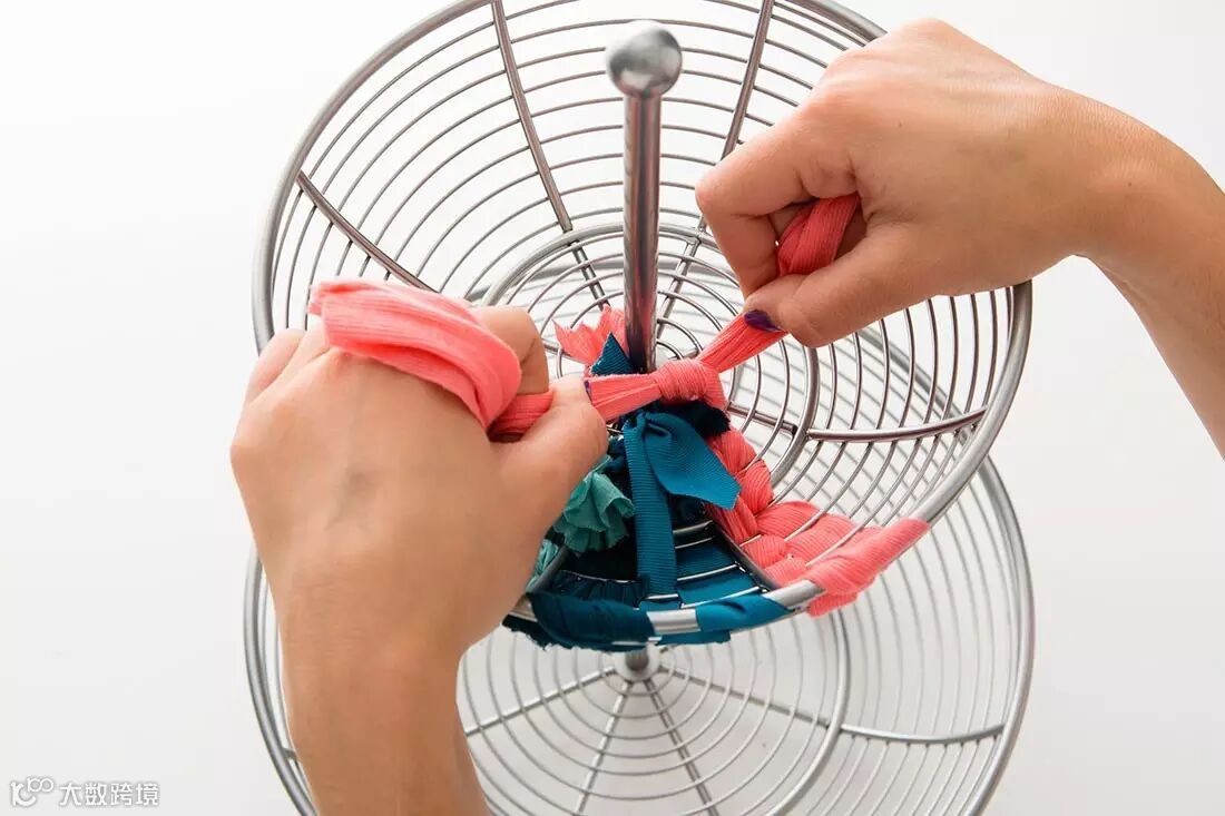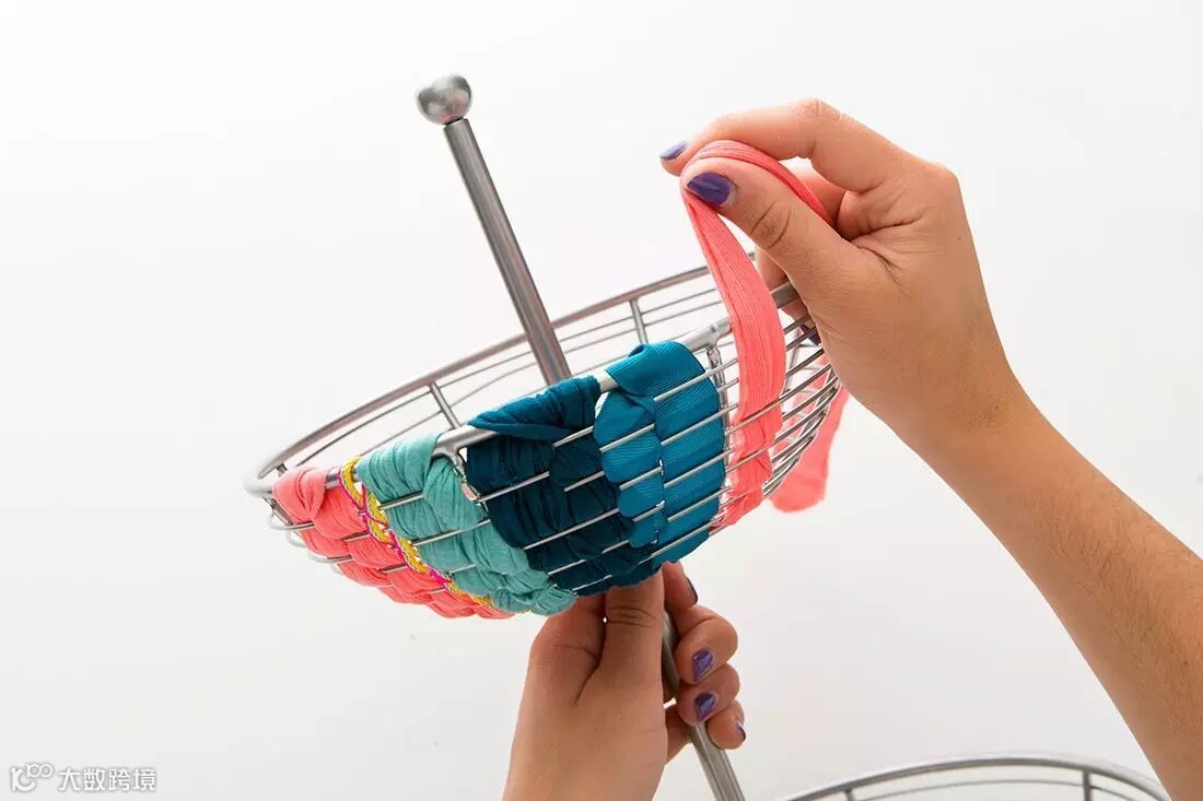 ➀绕着金属果篮的金属丝编织彩色布条,顶部拉紧,底部打结让布条不松。每编一条换一种颜色,直到缠满两层果篮。