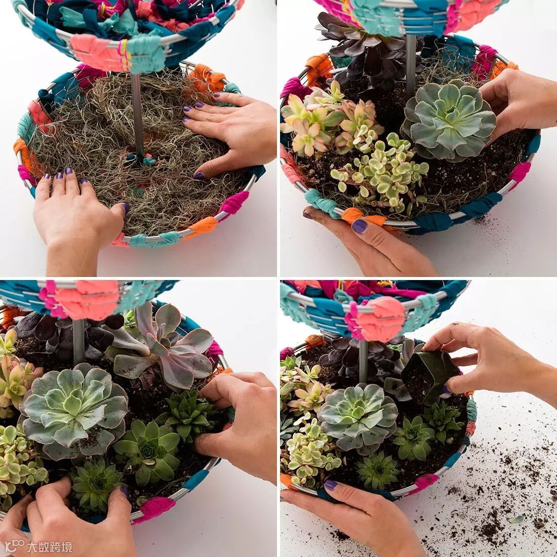 这一步需要注意的是优先布置大多肉,大多肉的位置固定住以后可以用小多肉去填缝隙,不同颜色、不同品种的多肉需要错落有致的填在篮里,会更有立体感。