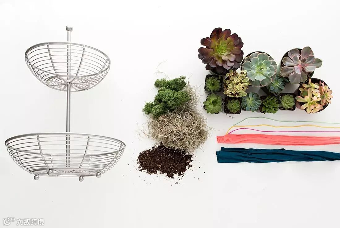 ➂上层果篮底部也布置苔藓,然后加泥土到中间高度,在表层布置苔藓,造成高低不平的效果,在泥土上挖小坑,埋进小多肉,再把土盖回去,固定住多肉即可。如果有藤蔓,可以随意的布置一些,会更有生趣。