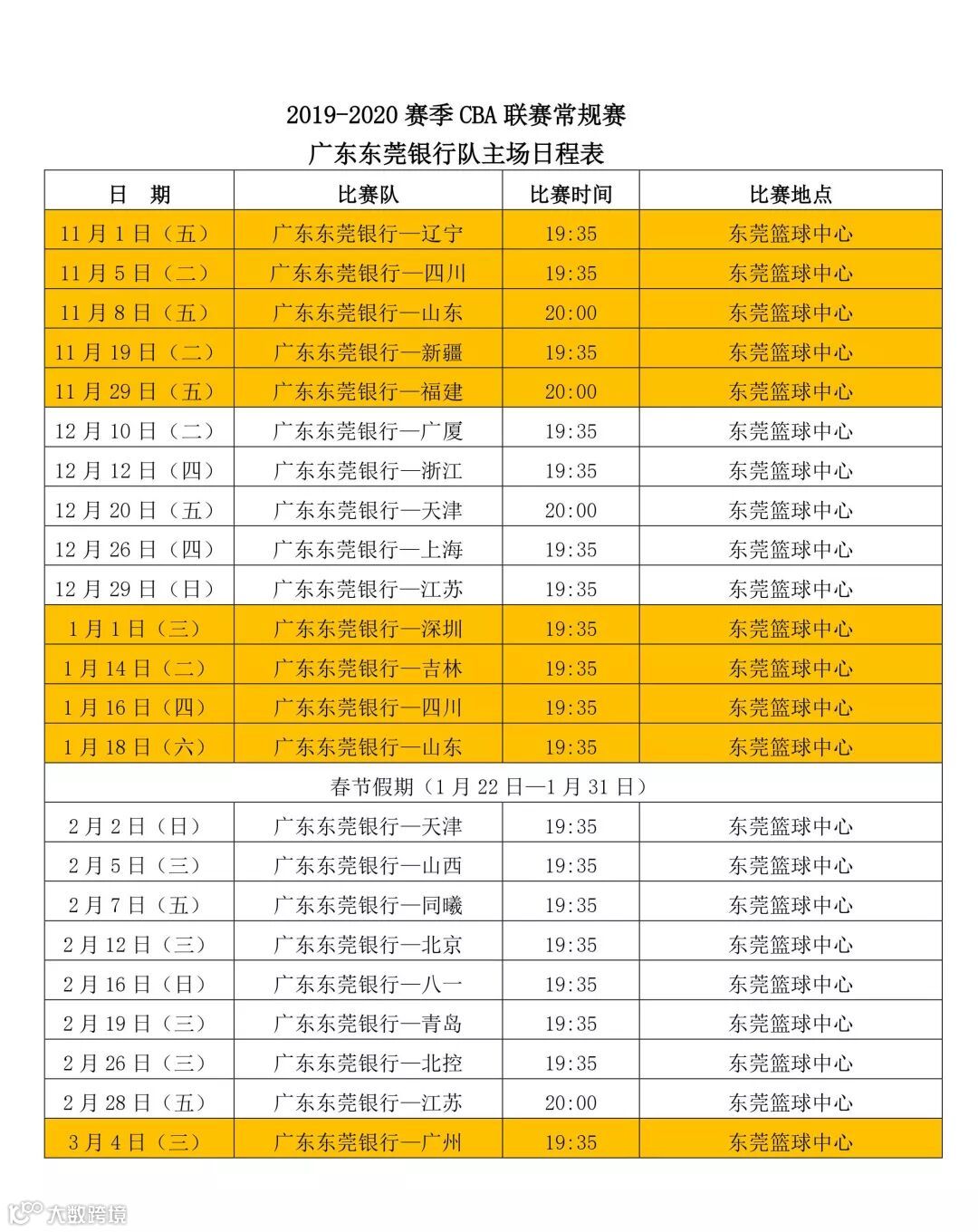 广东东莞银行作为卫冕冠军将于11月1日揭幕战在主场东莞篮球中心对阵2017-2018赛季CBA联赛总冠军辽宁队,新赛季广东东莞银行主场比赛部分场次开赛时间由19:35分改为20:00开赛,其中20:00开赛比赛分别为: