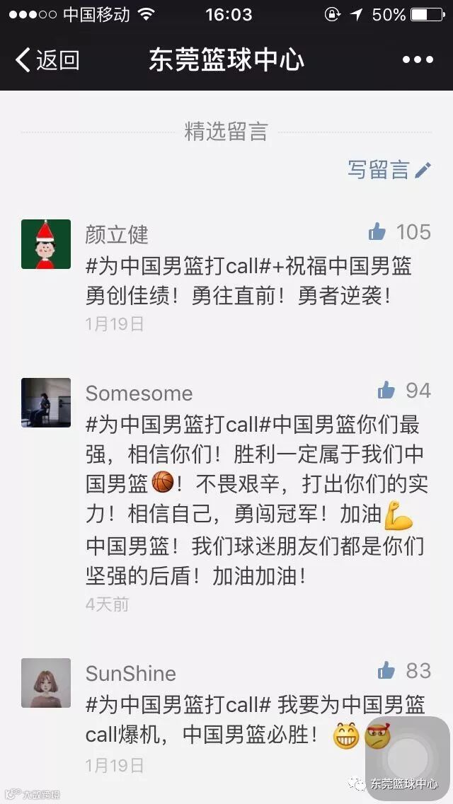 #为中国男篮打call#行动现排名第一的是微信名为“颜立健”球迷,打call数为105,赶紧叫你朋友为你点