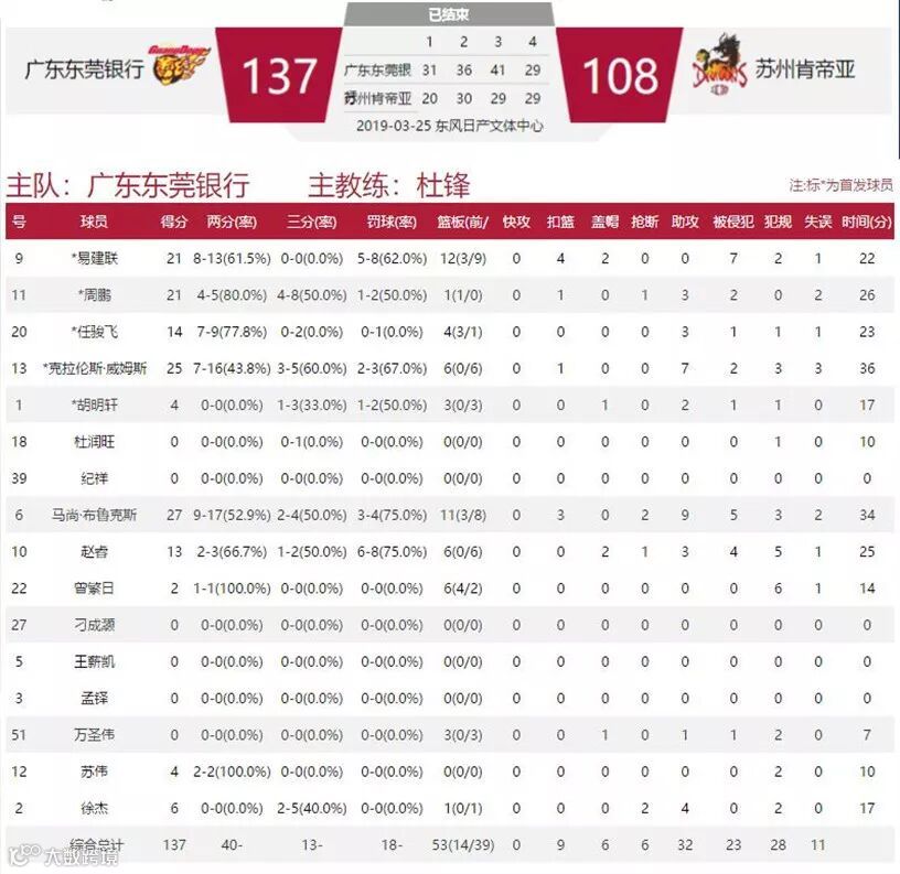 昨晚CBA季后赛四分之一决赛广东VS苏州G1比赛在东风日产文体中心开打,广东东莞银行137:108大胜苏州肯帝亚,大比分1-0领先。布鲁克斯27分11篮板9助攻、威姆斯25分7助攻6篮板、易建联21分12篮板、周鹏21分3助攻、任骏飞14分、赵睿13分6篮板。