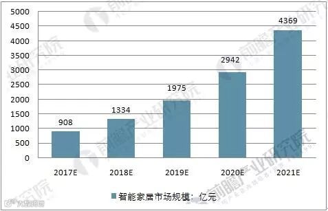 据前瞻产业研究院发布的《智能家居设备行业市场前瞻与投资策略规划报告》数据显示,2014年,我国智能家居产业市场规模达到290亿元;2015年,我国智能家居市场规模达403.40亿元,同比增长41%。2017年我国智能家居市场规模达到908亿元,未来五年(2017-2021)年均复合增长率约为48.12%,2021年市场规模将达到4369亿元。