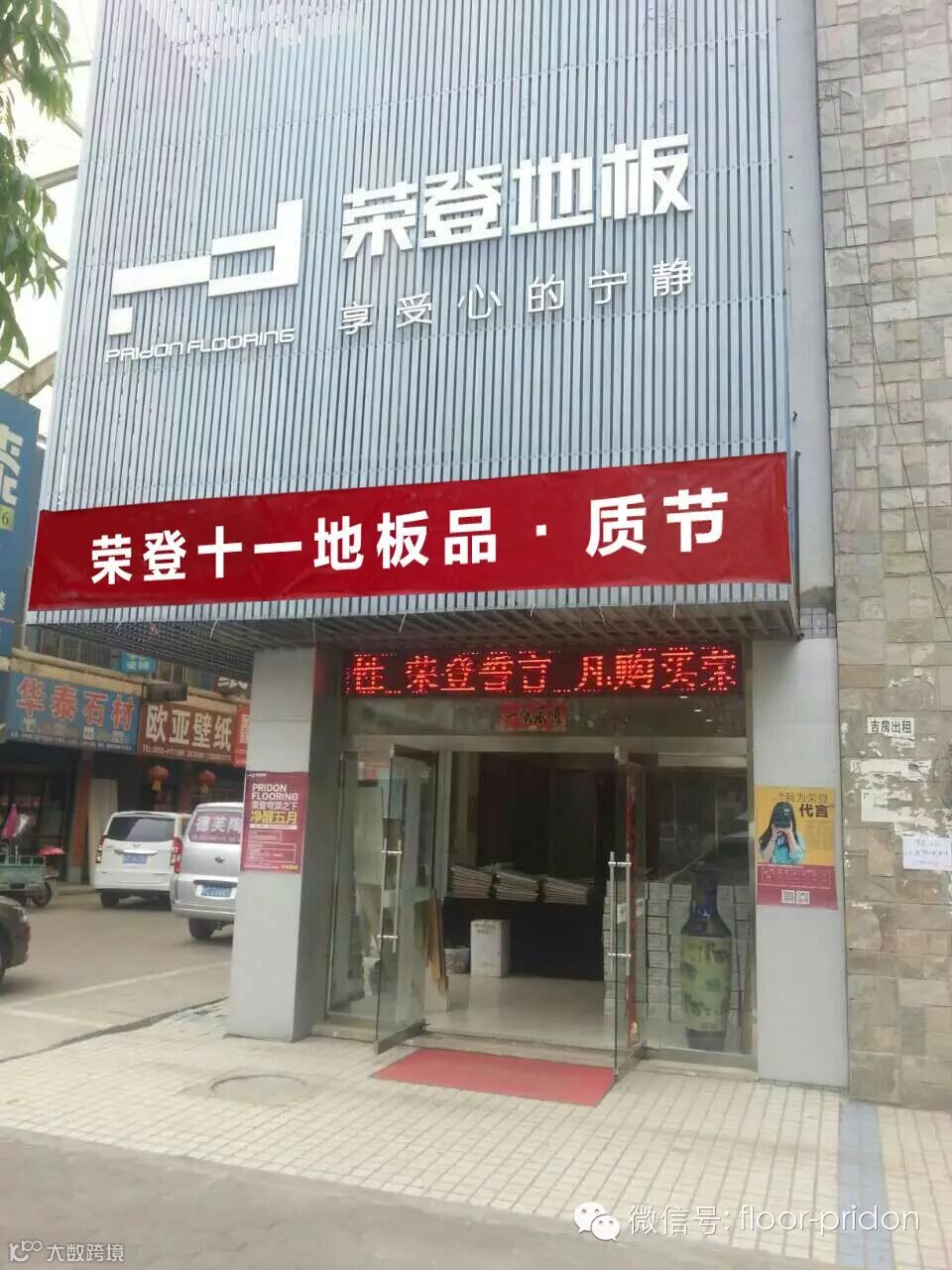 挂在店头,红色醒目,突出主题,引导客户选购地板。