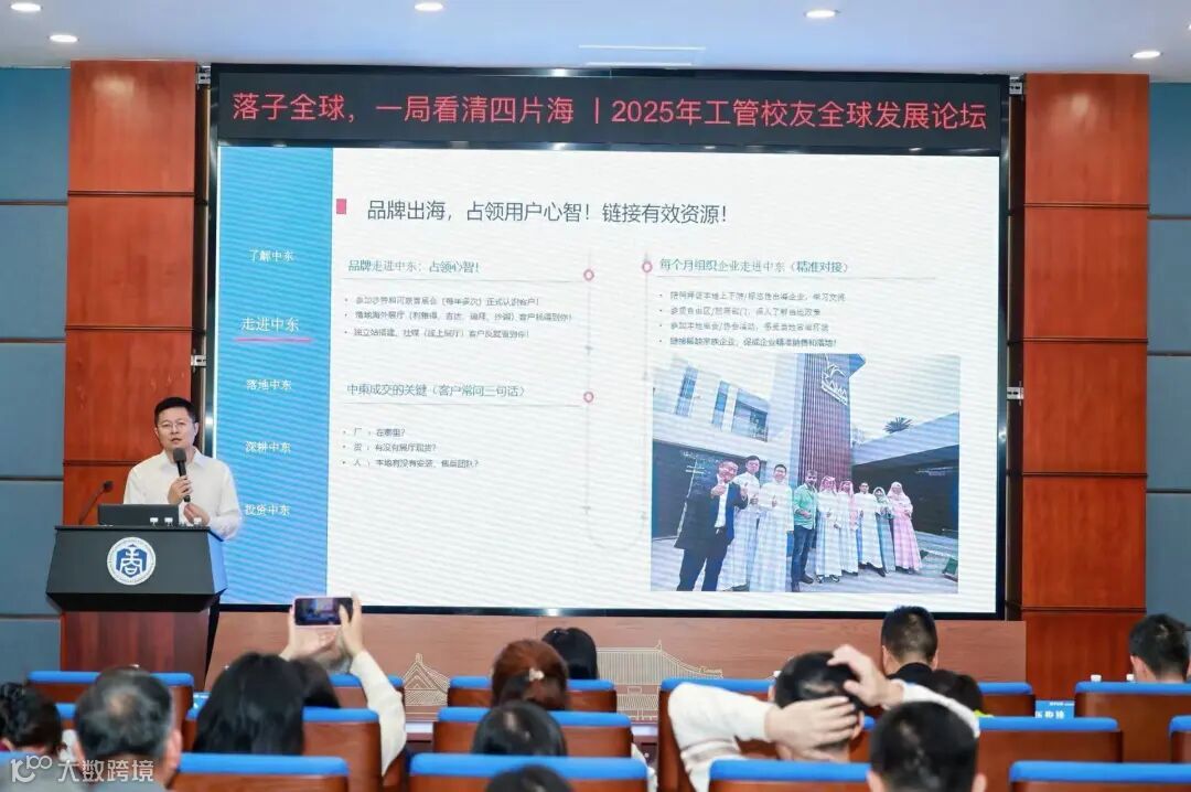 问财科技CEO唐洵润聚焦绿色经济崛起的中东市场,分享了GCC国家高人均GDP(4.5万美元)、年轻人口结构(平均30岁)的消费优势。他提出“厂、货、人”三大成交关键,详解了海外展厅搭建、本地售后团队组建、政策红利对接等实操策略,为企业链接中东优质资源提供了高效方案。