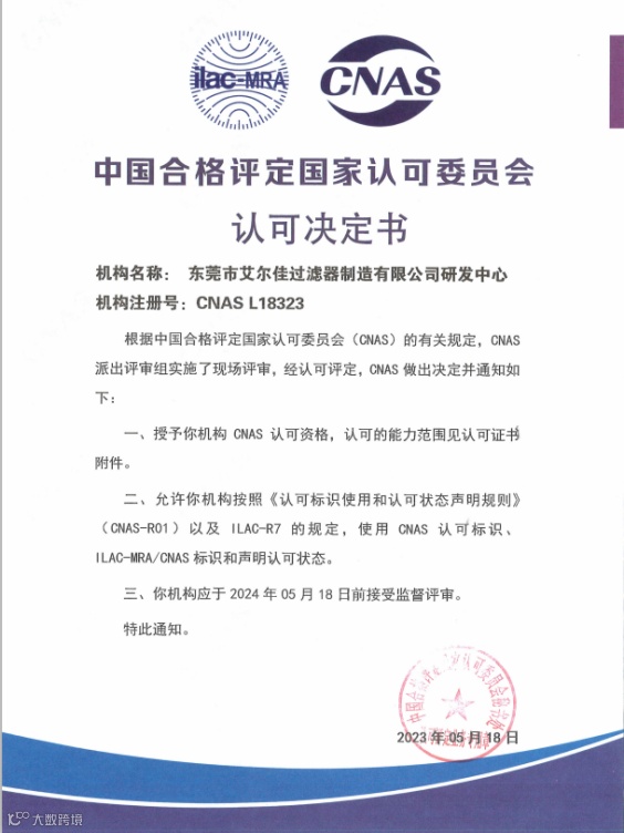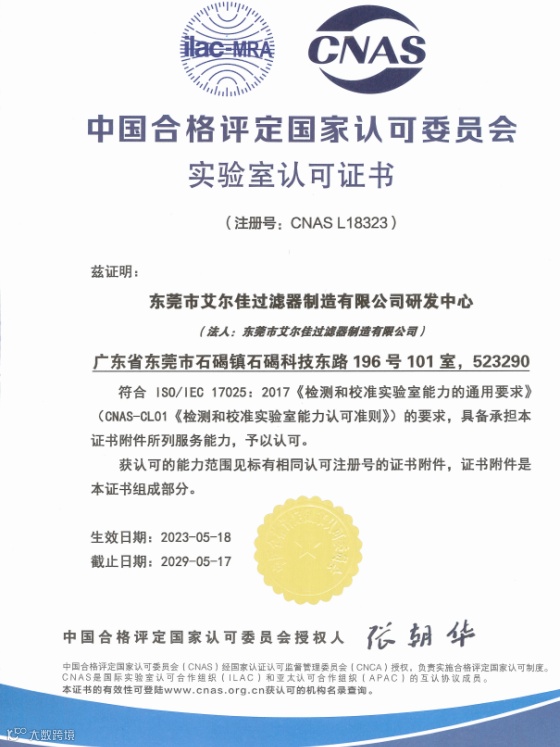 艾尔佳研发中心凭借专业的技术能力和管理水平,获得中国合格评定国家认可委员会(CNAS)评审专家组一致肯定,于2023年5月18日被授予CNAS实验室认可证书(证书编号:CNASL18323),标志着艾尔佳研发中心在硬件设施、检测能力和管理水平等方面已达到国际认可准则的要求。