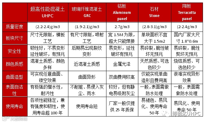 UHPC与GRC,铝板,石材,陶板之间性能差异对比