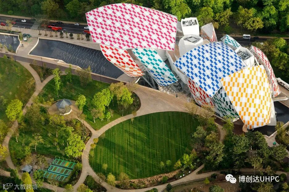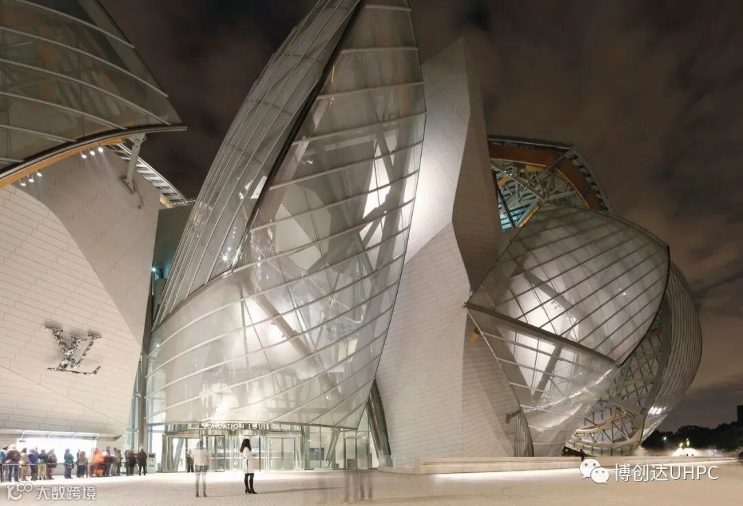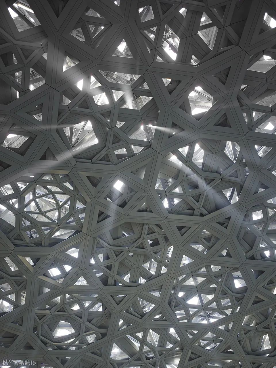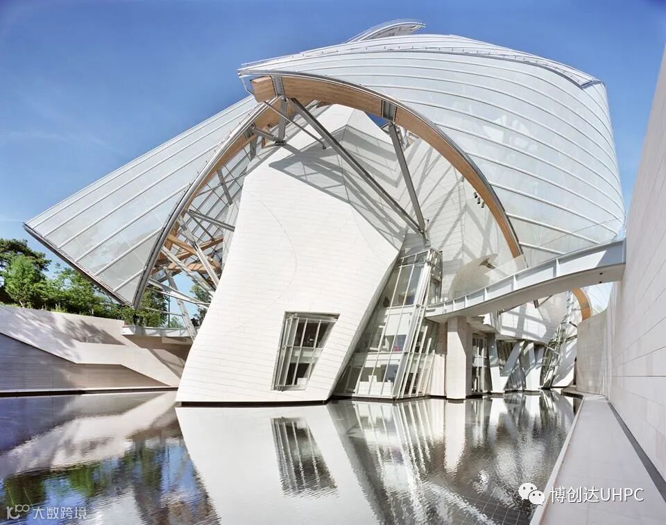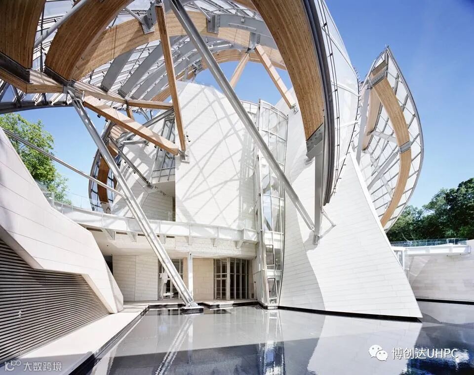 阿布扎比卢浮宫同样也是普利兹克奖得主让·努维尔的代表作,建筑群的立面由3900块高性能纤维混凝土(UHPC)形成造型独特的穹顶结构。在超高混凝土强悍的性能下,整个穹顶机构基本不再需要其他的结构组件,纯粹而又通透,配合周边的水体环境,光影斑驳十分迷人。