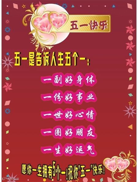 1、 五一到,劳动节,日子好,鸟在唱,花散香,心挂念,短信传,送祝愿:烦恼消,忧愁跑,欢笑颜,幸福绵,乐逍遥,快乐伴。