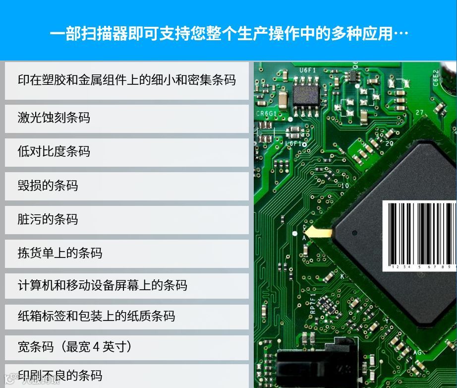 在生产手机、计算机、电视、服务器和其他电子产品时,您会更依赖条码来跟踪组件并确保产品质量。您的工作人员需要即时准确地采集各种表面上的所有尺寸条码。这一切都为电子制造行业的标签识别带来更高更精准的扫描要求。无论是一般用途的扫描器还是工业用DPM扫描器,都无法满足这样的扫描识别要求。