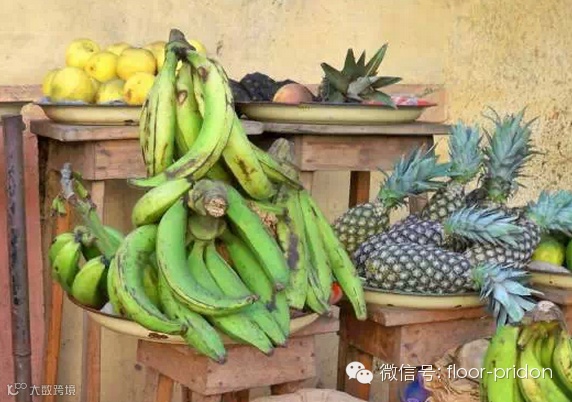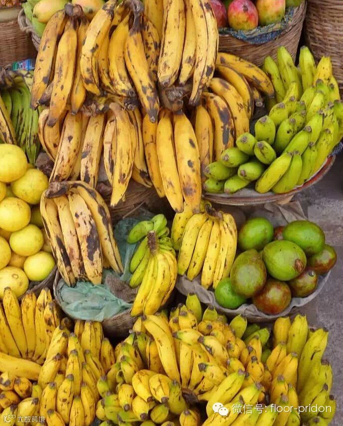 这种特殊的香蕉厉害了。长度惊人。照片中上面的是用来吃的水果,香蕉。下面的是油炸后作为主食的超级香蕉。你看,比菠萝都大。