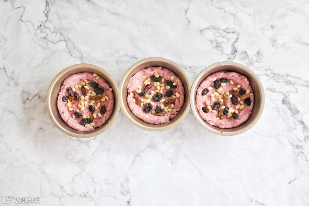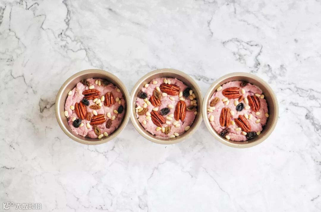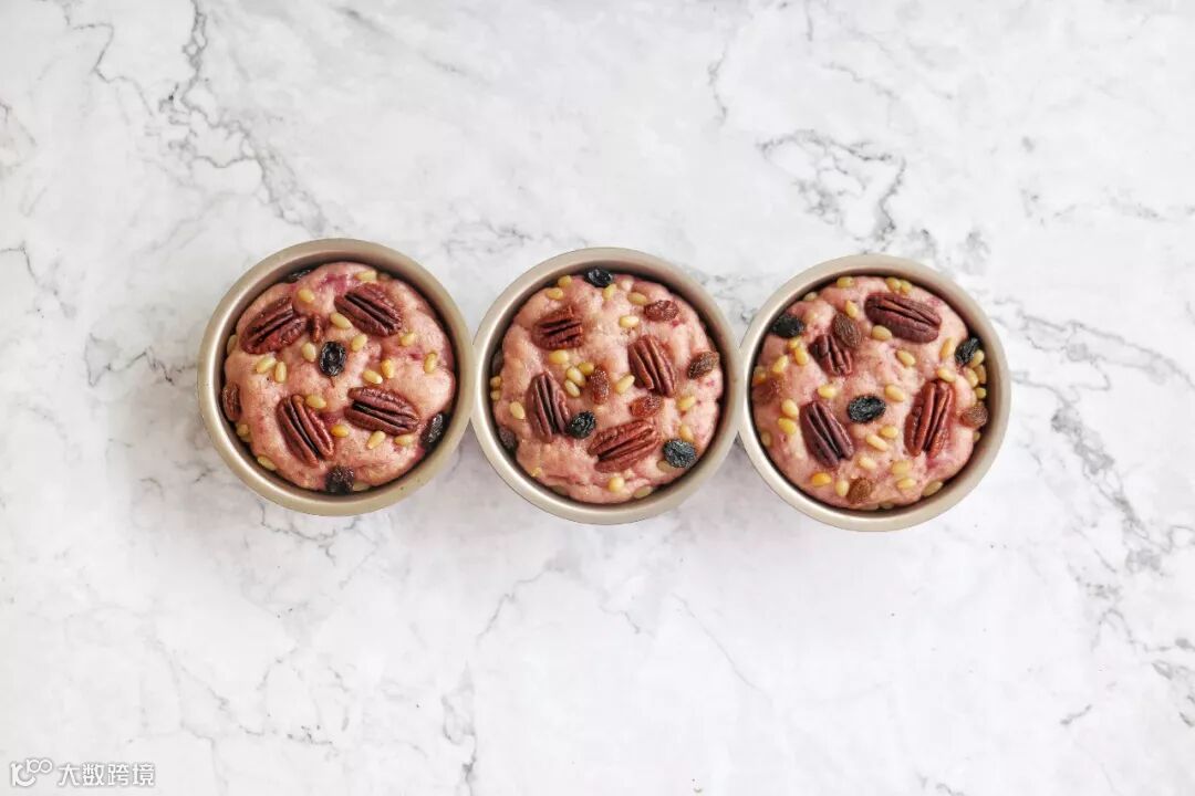模具内先放一层面团,把一半坚果、葡萄干均匀放上。
