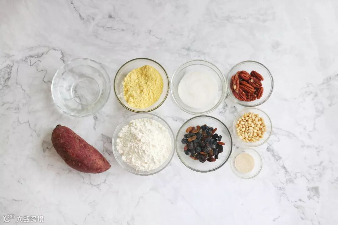 紫薯150克 面粉150克 玉米粉30克 砂糖40克 温水100克 松子20克 碧根果20克 葡萄干30克 酵母粉2-3克