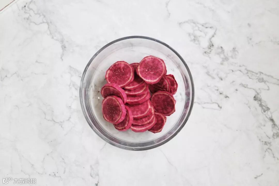 紫薯去皮切成薄片,放入有孔蒸盘。