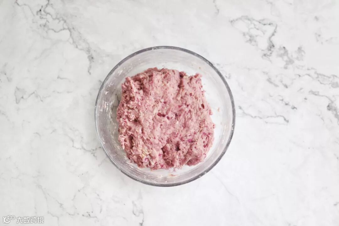 酵母粉用30度左右的温水溶解后,倒入粉类中,与紫薯一起和成团。