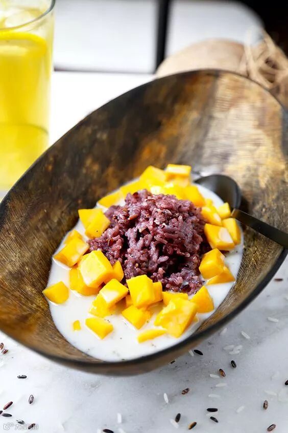 把糯米和紫薯搅拌均匀,碗中倒入适量牛奶,放入紫薯糯米饭,芒果切块加入。