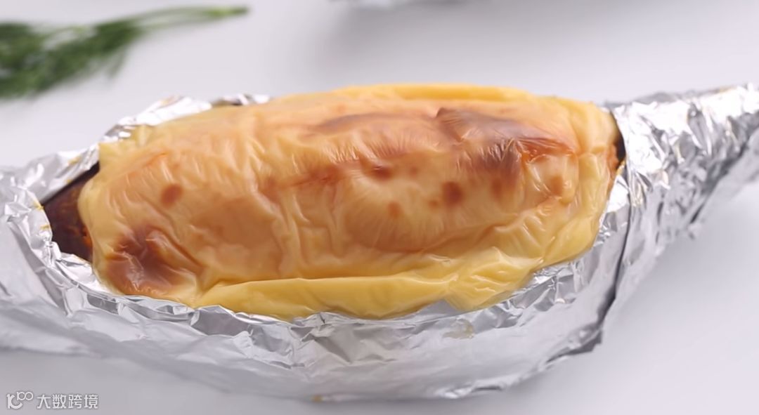 在红薯泥表面铺满芝士片,可以切片,铺满缝隙;