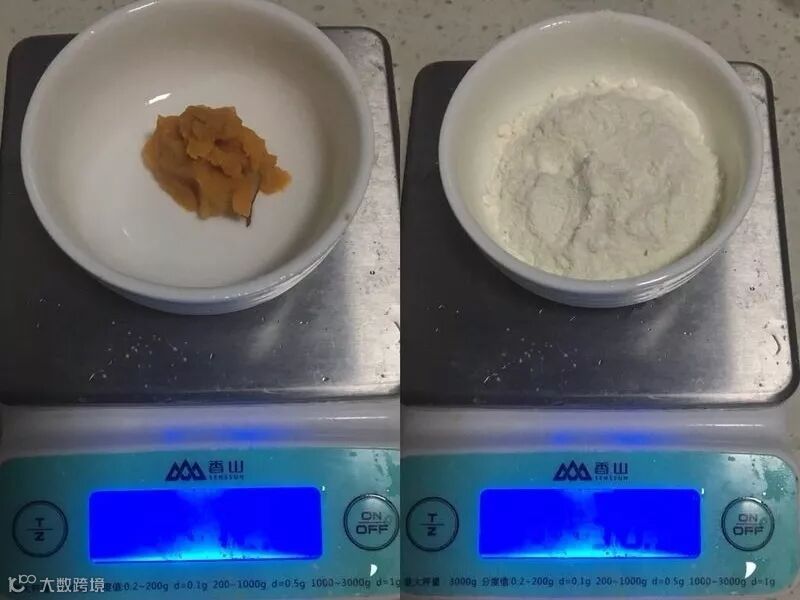 1、称好面粉、红薯泥、酵母、配方奶备用。