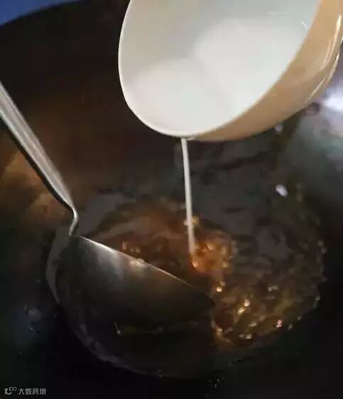 5.取另外一个锅,倒入调好的水淀粉和些许鸡精,开小火煮至透明粘稠,盛起浇在地瓜上。