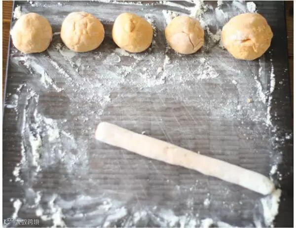 3.搓成条子,切成几个小块后,压扁,再在表面撒上些芝麻。