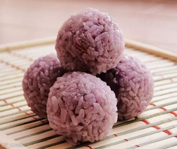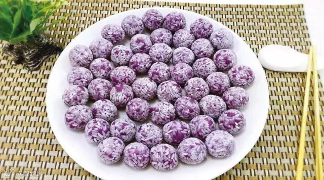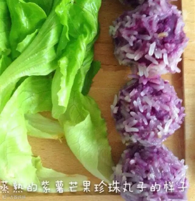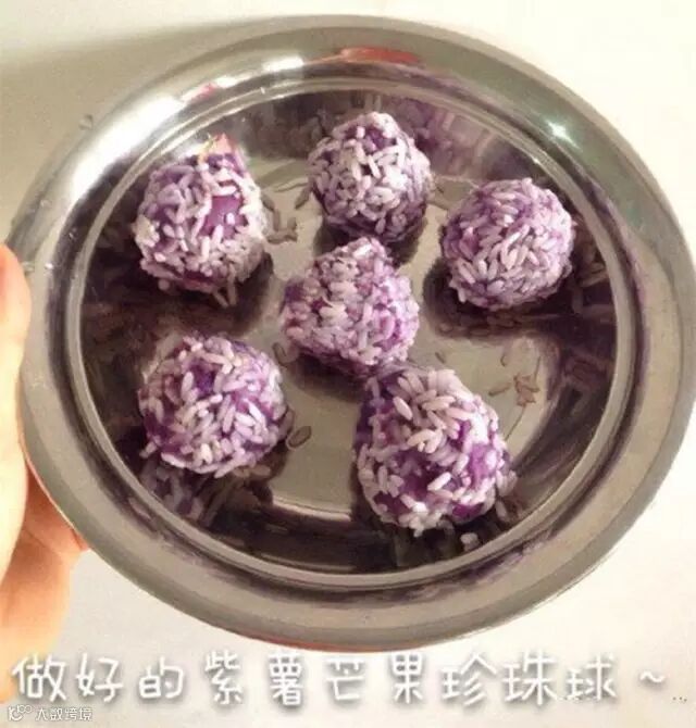 蒸好的紫薯芒果珍珠球像丸子