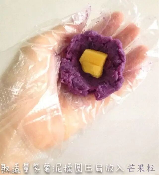 取适量紫薯压平放入芒果粒