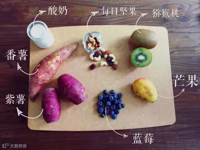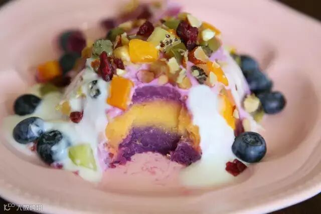 一勺下去,紫黄相间,颜色美极~本身番薯紫薯口感香甜软糯,蘸着酸奶和水果坚果酸酸甜甜,立马让人心情愉悦起来!