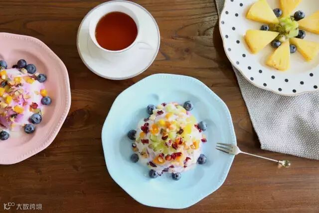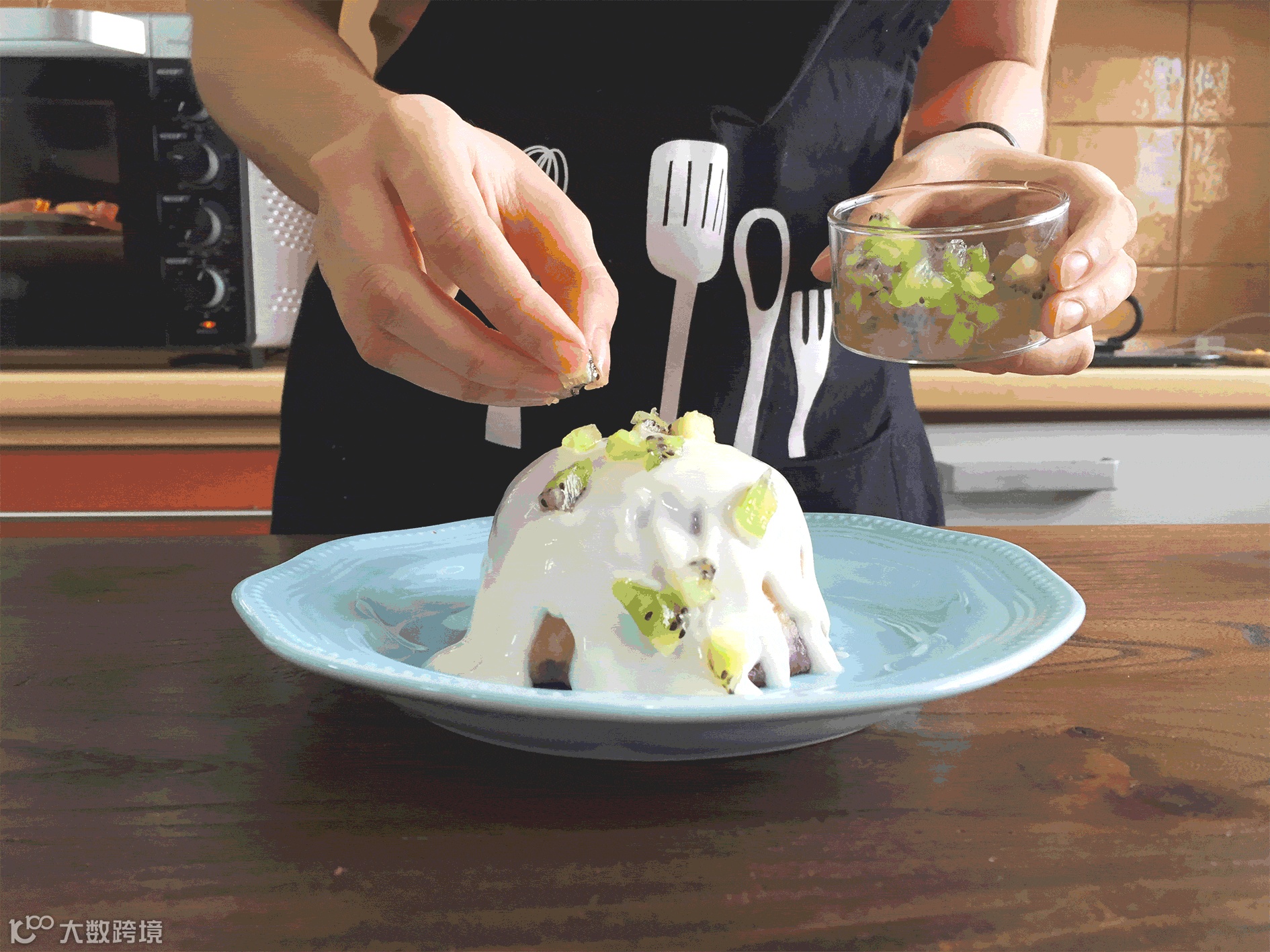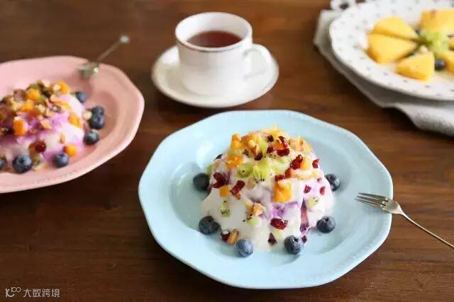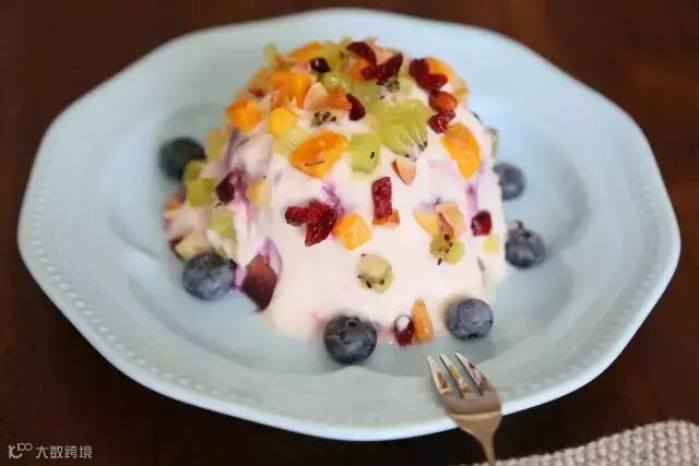 6.撒上切好的水果粒,坚果粒,一盘甜点就完成了!