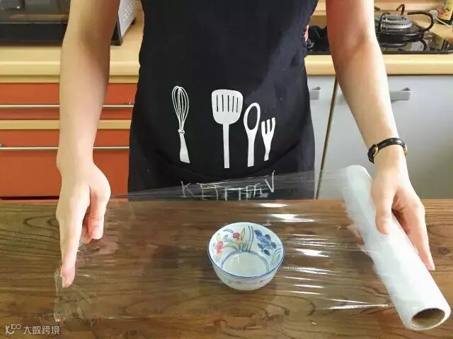 3.拿出一个圆形小碗,在上面铺一层保鲜膜垫在碗底。