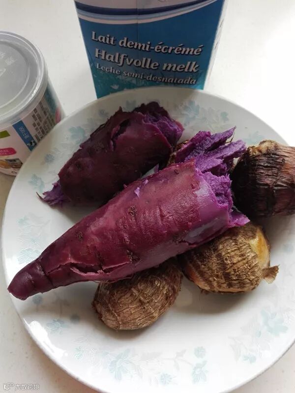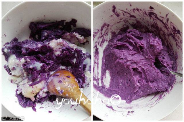 2. 紫薯、芋头趁热剥皮,用勺子压碎,放入炼乳搅拌均匀,待用。