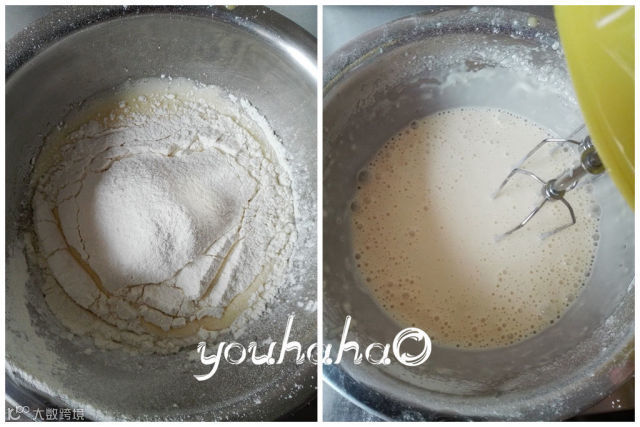 4. 筛入低粉、淀粉,加入牛奶,搅匀后用打蛋器继续搅打,打至面糊非常细腻,静置一会。