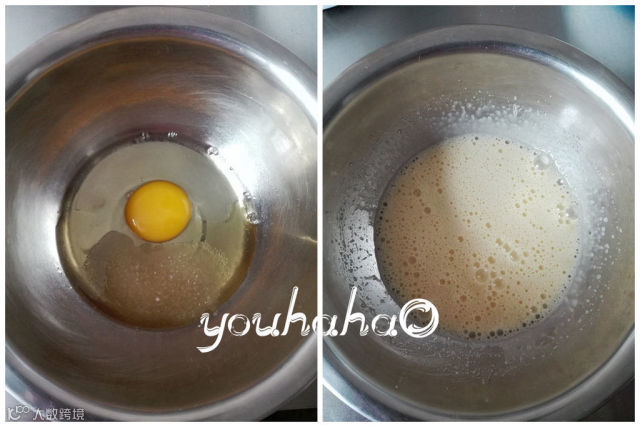 3. 一个鸡蛋与细砂糖、植物油一同放入盆里,用打蛋器搅打至细腻。
